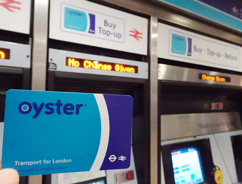 ロンドンで地下鉄やバスに乗る際には欠かせない「オイスターカード(Oyster Card)」はカード代だけで7ポンド(返金不可)もするのがロンドン交通局らしいといえるだろうか。背後に写る券売機の「No Change Given(お釣りは出ない)」という表示も現金利用時は注意したいところ