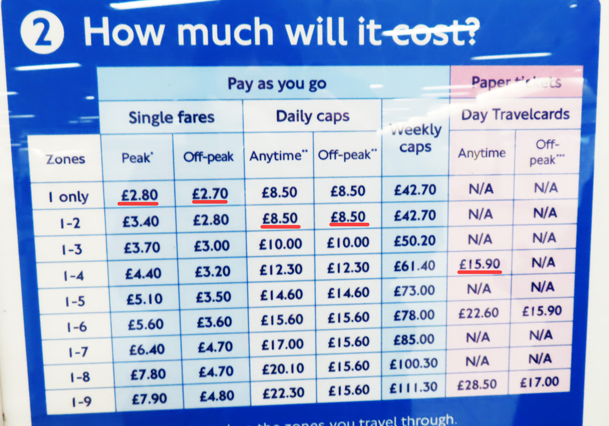ロンドン地下鉄の運賃案内、ここに紙チケットの1回乗車券(6.7ポンド)の案内は無い。ICカード・クレジットカードなどによる初乗りの最低価格はオフピーク1ゾーン内の2.7ポンド(540円)だが、ピーク時(平日6:30~9:30/16:00~19:00)は2.8ポンド(560円)に上昇。1日に引かれる最大の運賃(デイリーキャップ=Daily caps)はゾーン1と2だけを使うなら8.5ポンド(1700円)となる。なお、紙チケットで買える1日乗車券「デイトラベルカード(Day Travelcard)」はゾーン1~4に使用できるが15.9ポンド(3180円)と高価。この運賃案内は2024年12月時のもので、2025年3月以降は値上げで変わる予定