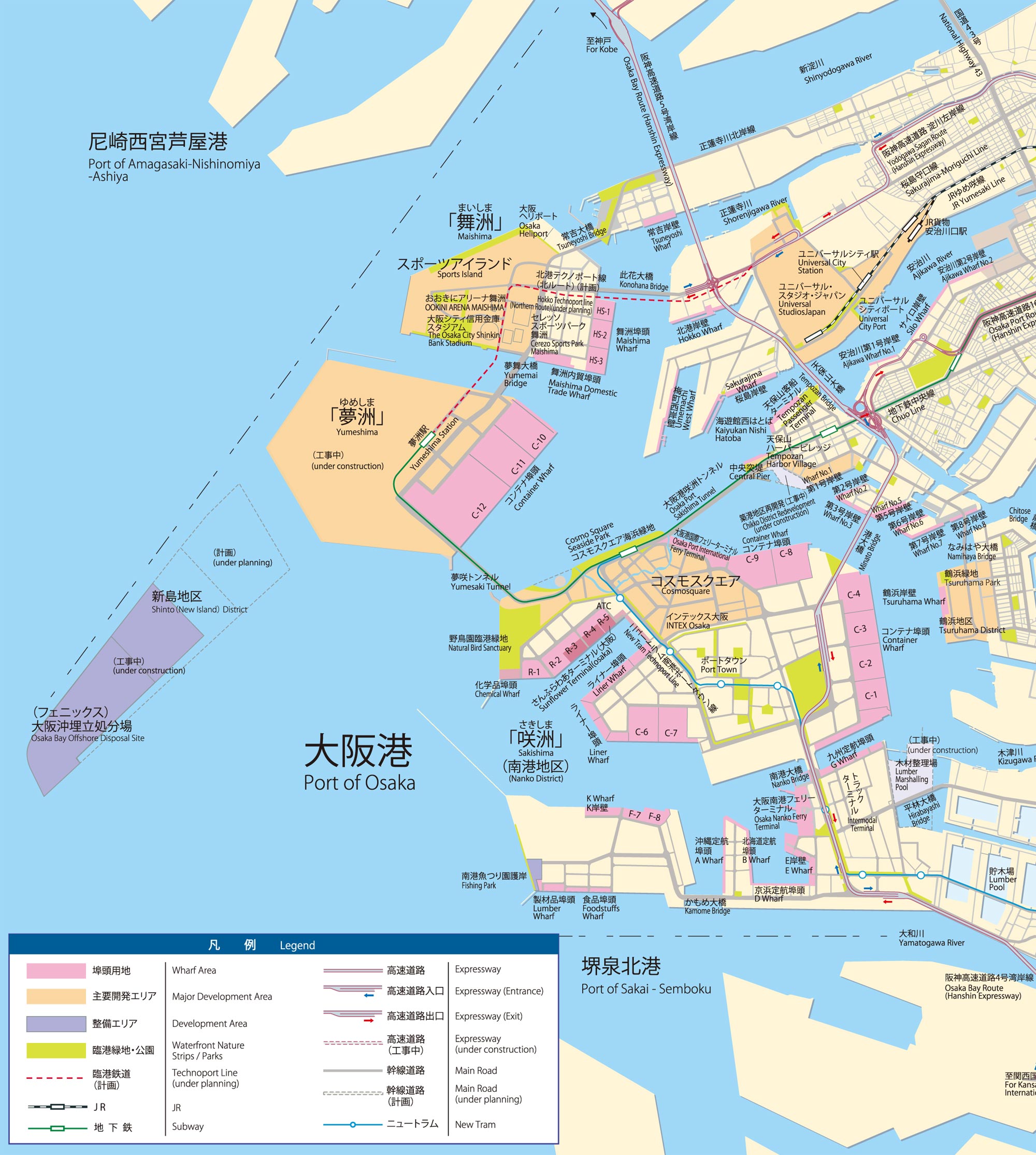 大阪港に浮かぶ人工島は「洲(す)」の字を「しま」と読ませる島名が付けられていて、陸地を拡張したイメージの強い巨大な「南港」でさえ一連の埋立地には咲洲(さきしま)という名が付けられている。