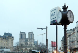B線とC線が交わる「サンミッシェル=ノートルダム駅(St-Michel Notre-Dame)」のサンミッシェル橋近くに置かれた出入口、左奥がノートルダム大聖堂(2024年12月)