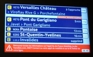 サンミッシェル=ノートルダム駅の列車案内板、同じ方面でも行先が複数あり、「 Versailles Château」(ヴェルサイユ=シャトー)と表示された列車がベルサイユ宮殿の最寄り駅まで行く(2024年12月)