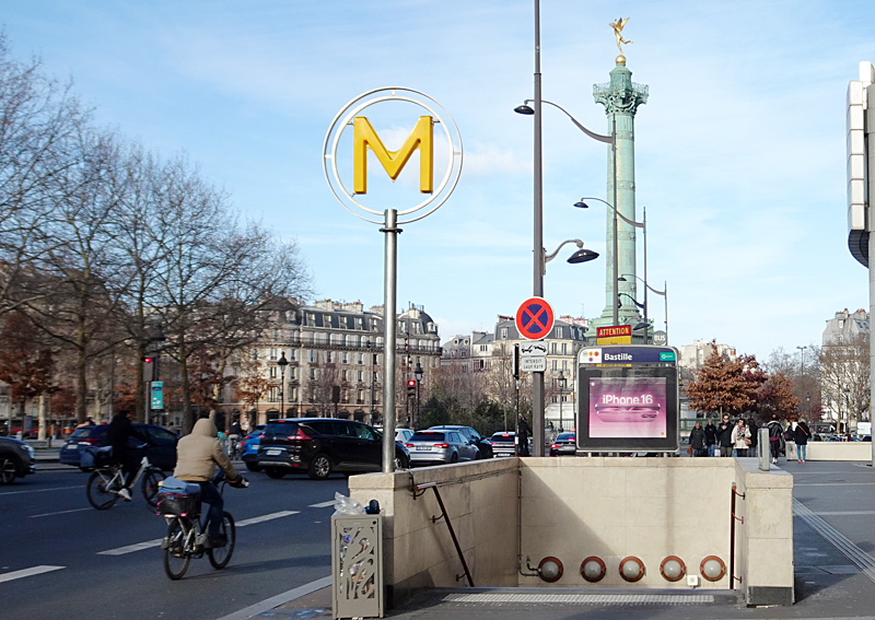 利用客が多いため列車はすぐにやってくる。写真の「バスティーユ(Bastille)駅」だけが地上に置かれ、ほかはすべて地下にある(2024年12月)