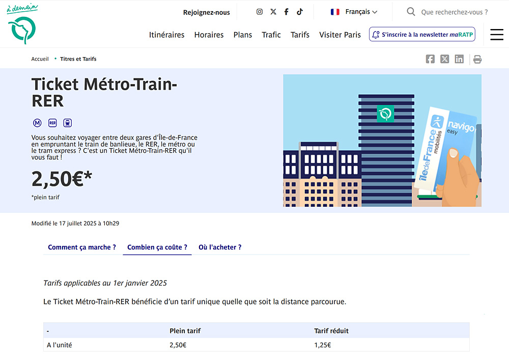 2024年末までパリ市内では地下鉄もバスも共通の1回乗車券(2.15ユーロ)となっていたが、2025年1月からは「鉄道(2.5ユーロ)」と「バス(2ユーロ)」は別の運賃体系に変わった。バスは0.15ユーロ値下げされたことになる。