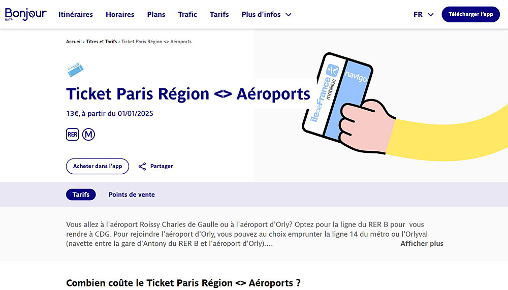 RER「B線」などで空港駅(Aéroport)にアクセスすると1回乗車(2時間有効)の運賃が13ユーロに跳ね上がる(bonjour-ratp.frより)