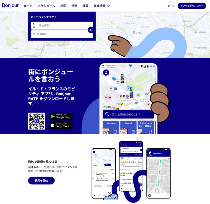 公式サイト「Bonjour RATP」の英語版をブラウザ(Google Chrome)の「日本語翻訳」で見た際の画面、少し違和感もあるが日本語で多くの情報が得られる(2025年8月1日閲覧、https://www.bonjour-ratp.fr/en/より)
