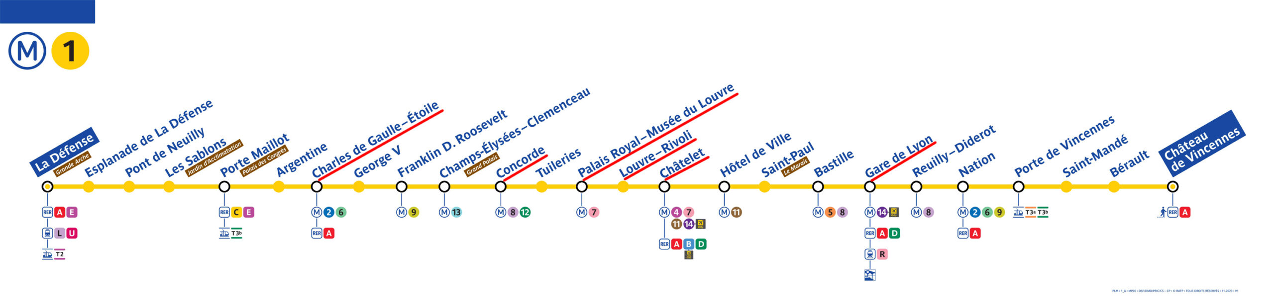 メトロ「1号線」の路線図、観光スポットの最寄り駅が多いゆえに列車の方向(ホーム)を間違いやすく、逆方面の列車に乗らないよう注意したい(RATPが提供している2025年7月時点の路線図に主要駅部分に赤い線を入れる加工を行った)