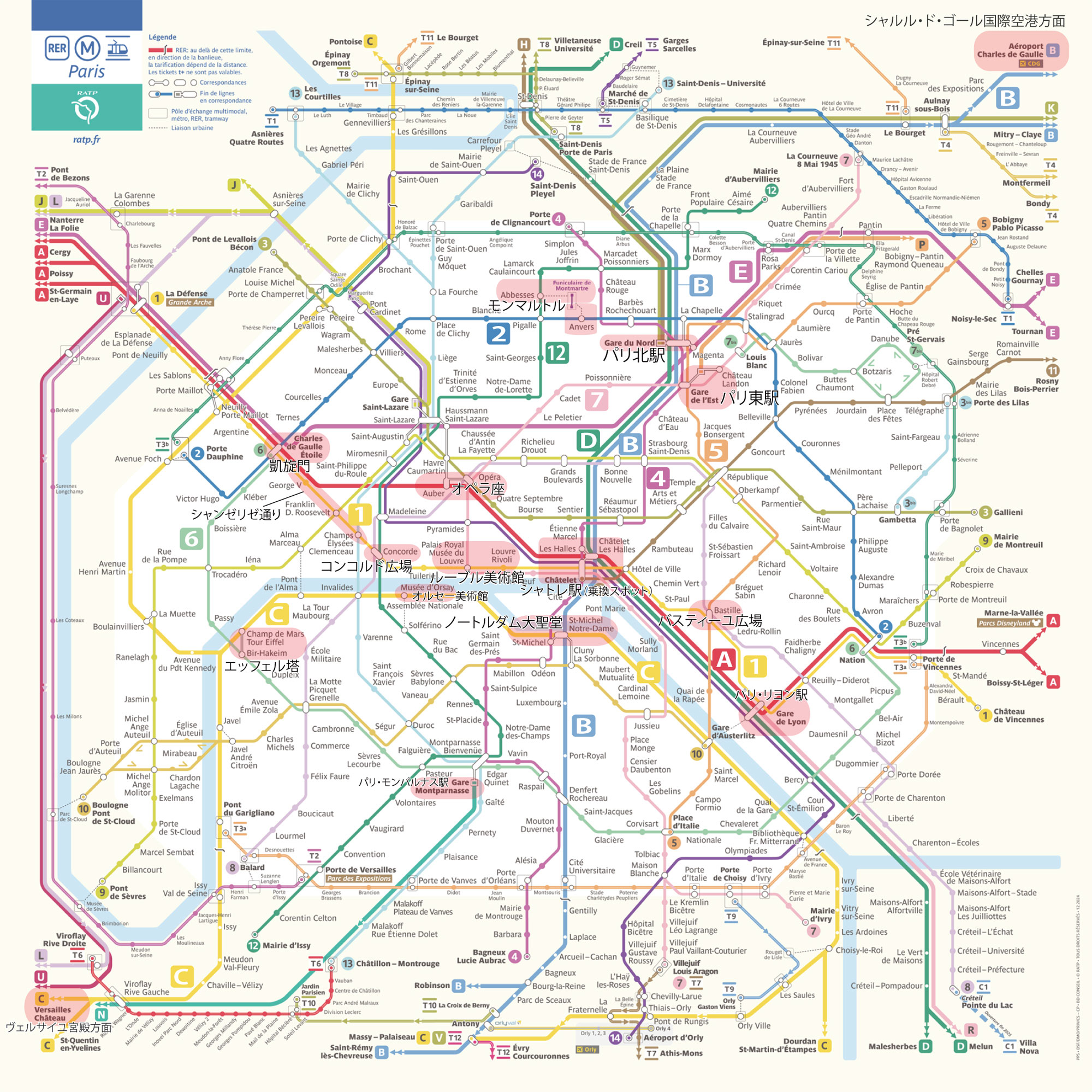 パリ市内の「メトロ」(1~14号線)と「RER」(A~E)などの鉄道路線図、観光スポットの近くには「1」「B」「C」の駅が目立つ。右上がシャルル・ド・ゴール国際空港方面、左下がベルサイユ方面(RATPが提供するパリ市内路線図「Imprimer le plan」に観光地やターミナル駅の位置、路線番号などを追記した。2025年7月ダウンロードのデータを加工)