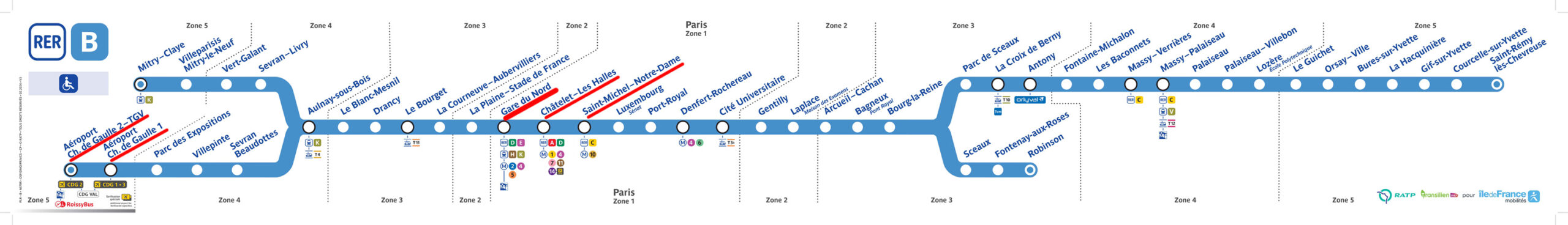 RER「B線」の路線図、左下が「シャルル・ド・ゴール国際空港(Aéroport Paris-Charles-de-Gaulle)」、中央左寄りがパリ中心部の「パリ北駅(Paris Gare du Nord)」など(RATPが提供している2025年7月時点の路線図に主要駅部分に赤い線を入れる加工を行った)